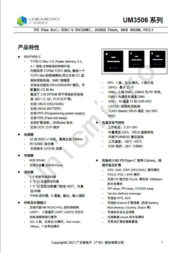 封裝封面,UM3506家族共有多個封裝尺寸,分別是QFN32、QFN24,適用于工程師根據(jù)PCB大小布局進行方案開發(fā)設計。充電頭網(wǎng)向廣芯微了解到,UM3506系列采用了當下關注度相當高的RISC-V架構(gòu),這也是業(yè)界率先將RISC-V與USB PD3.1相結(jié)合的快充芯片。