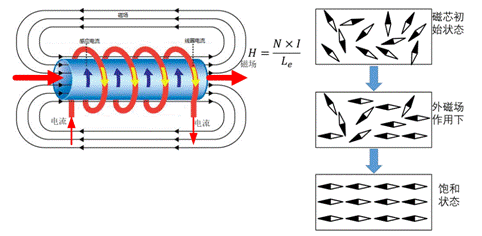 • 磁芯在磁場(chǎng)的作用下會(huì)被磁化,其內(nèi)部磁疇會(huì)慢慢旋轉(zhuǎn);