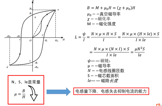 • 當(dāng)電感飽和后,µ會(huì)大幅度減小,最終導(dǎo)致電感量大幅降低,失去抑制電流的能力。