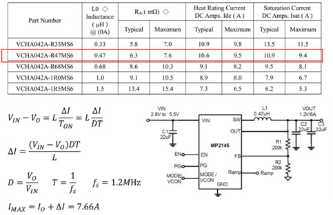 以Buck芯片MP2145為例,可以按照如下公式計(jì)算,將計(jì)算結(jié)果電感規(guī)格值相比較就能判斷電感是否會(huì)飽和。