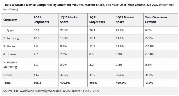 IDC:2022Q1全球可穿戴設(shè)備出現(xiàn)首次下滑 同比降幅3%