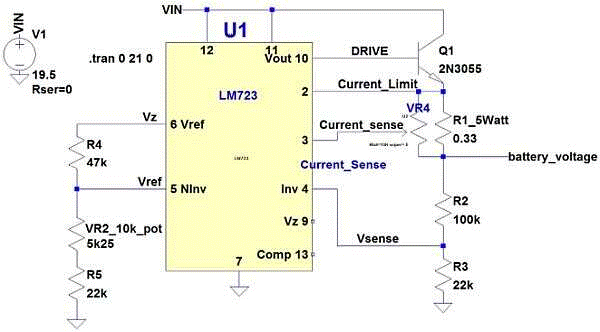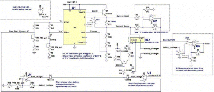 U1 和 Q1 構(gòu)成恒壓限流電源,VR2 設(shè)置最大充電電壓,VR4 設(shè)置電流限制。D4 在大約 4mV/ºC 時(shí)提供一些熱降額。