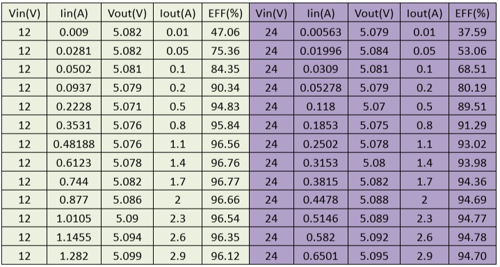 注:Cin=35V/100uF(固態(tài)),Cout=470uF(固態(tài)), RT 懸空,F(xiàn)B 分壓電阻 24.9K, 100K,SW 吸收 1nf+20R,L=44125=22uH(19 圈),此為 DEMO 測試數(shù)據(jù)。