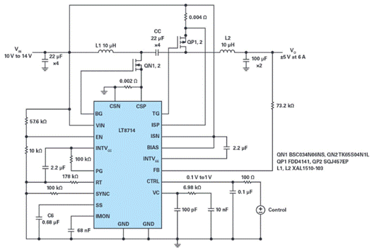 圖1.基于LT8714的雙象限電源的電路圖,6 A時,其VIN 12 V,VO ±5 V。