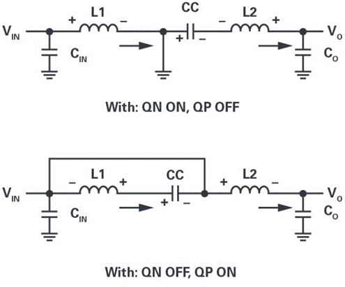 圖1所示為雙象限電源LT8714的電路圖。動力系統(tǒng)由NMOS QN1、NMOS QN2、PMOS QP1、PMOS QP2、電感L1、電感L2、耦合電容CC,以及輸入和輸出濾波器組成。電感L1和L2是兩個分立式非耦合電感,可以降低變換器成本。