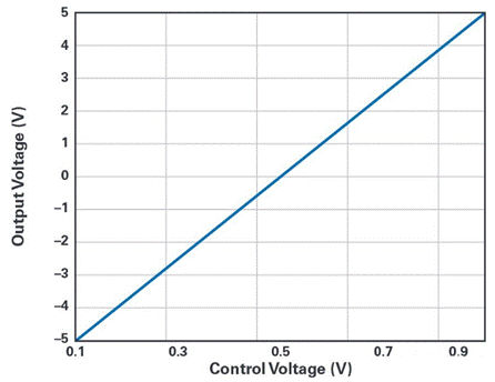 圖4.輸出電壓VOUT與控制電壓VCTRL的關(guān)系圖。當(dāng)VCTRL從0.1 V增加至1 V時,VOUT從–5 V逐漸變化到+5 V。