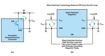 圖1. (A) 異步單芯片升壓轉(zhuǎn)換器具有單個(gè)熱回路,其中包含一個(gè)外部續(xù)流二極管。(b) Silent Switcher轉(zhuǎn)換器具有兩個(gè)(相反)熱回路和全集成開關(guān)。