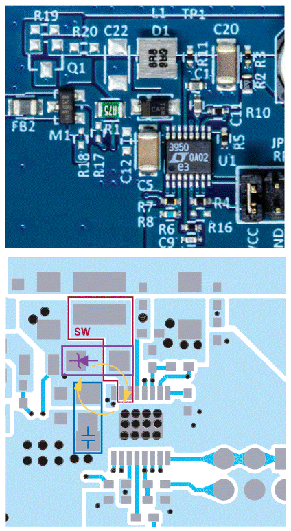 圖2. LT3950 (DC2788A)異步熱回路包括D1續(xù)流二極管。盡管如此,續(xù)流二極 管和輸出電容仍與LT3950 16引腳MSE封裝緊密貼合。突出顯示的異步開關(guān) 節(jié)點(diǎn)小且緊湊,但并非不可能。開關(guān)節(jié)點(diǎn)的布局可能是實(shí)現(xiàn)低輻射結(jié)果的關(guān)鍵。