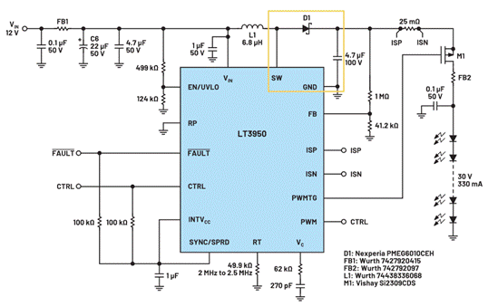 圖3. LT3950 LED驅(qū)動(dòng)器是一個(gè)異步單芯片1.5 A、60 V升壓轉(zhuǎn)換器。升壓轉(zhuǎn)換器熱回路(黃色突出顯示)包含一個(gè)分立式續(xù)流二極管,不會(huì)減弱高頻率輻射。