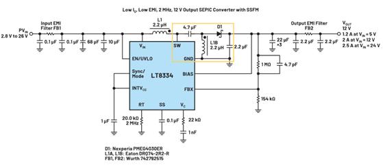 圖4. LT8334 40 V、5 A異步單片式升壓IC被用于SEPIC應(yīng)用中。SEPIC轉(zhuǎn)化器熱回路(黃色突出顯示)包含一個(gè)分立式續(xù)流二極管和一個(gè)耦合電容,不會(huì)減弱輻射。