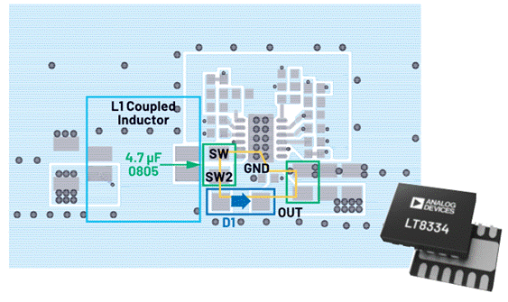 圖5. LT8334單芯片40 V、5 A異步開關(guān),集成到微型4 mm × 3 mm 12引腳散熱增強(qiáng)型DFN封裝中。LT8334 SEPIC (EVAL-LT8334-AZ)的熱回路布局中包含這個(gè)微型DFN、一個(gè)陶瓷耦合電容、一個(gè)陶瓷輸出電容和一個(gè)小型續(xù)流二極管。