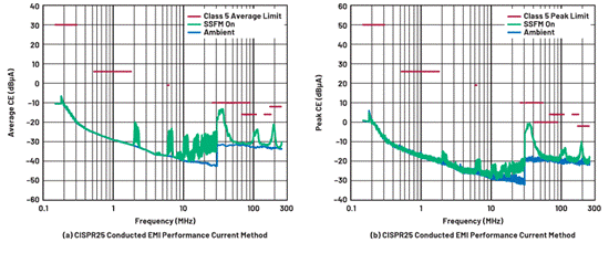 圖9. DC2788A LT3950通過了(a)平均和(b)峰值CISPR 25 5類傳導(dǎo)輻射測試(電流探針方法)。