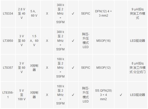 雖然熱回路中有額外的耦合電容,耦合電感中有額外的端口(使開關(guān)節(jié)點(diǎn)的數(shù)量翻倍),LT8334 SEPIC還是能保持低輻射。EVAL-LT8334-AZ SEPIC 12 VOUT 評估套件也使用2 MHz和SSFM,能提供低輻射。EVAL-LT8357-AZ升壓控制器可以實(shí)現(xiàn)相似的性能。有關(guān)這些器件的完整輻射結(jié)果、原理圖和測試選項(xiàng),可以訪問analog.com,查看對應(yīng)的產(chǎn)品登錄頁面。表1列出了一個(gè)新的低EMI異步升壓和SEPIC轉(zhuǎn)換器系列。單芯片IC和控制器IC結(jié)構(gòu)簡單、成本低,采用多種拓?fù),具有大功率功能和低輻射,因此非常?shí)用。當(dāng)超低輻射成為首要的要求時(shí),也可以使用高電流Silent Switcher升壓轉(zhuǎn)換器。