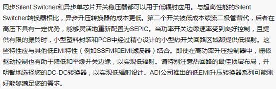 帶分立式續(xù)流二極管的異步轉(zhuǎn)換器仍然可以實(shí)現(xiàn)低輻射。如果在設(shè)計(jì)時(shí)特別注意熱回路布局和dV/dt開關(guān)邊緣速率,那么有可能使用異步轉(zhuǎn)換器實(shí)現(xiàn)低EMI開關(guān)應(yīng)用。在展頻(SSFM)中集成降低輻射的額外措施是必要的。單芯片開關(guān)穩(wěn)壓器,例如 LT3950 60 V、1.5 A異步LED驅(qū)動(dòng)器和 LT8334  40 V、5 A異步升壓轉(zhuǎn)換器,每個(gè)都在器件中集成了單個(gè)低端電源開關(guān),但它們依賴外部續(xù)流二極管,同時(shí)仍然可以實(shí)現(xiàn)低輻射!它的工作原理是什么呢?