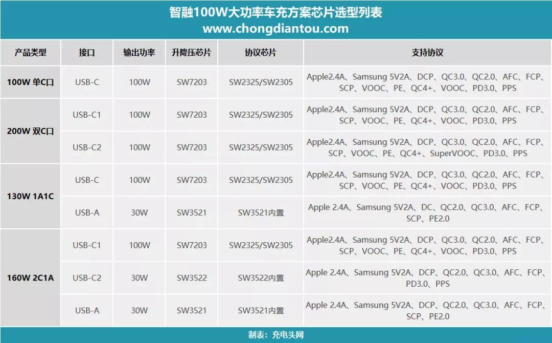 針對(duì)于大功率多口獨(dú)立快充車充市場(chǎng),無論是單口100W還是雙口盲插,也無論是130W雙口獨(dú)立快充,還是160W三口獨(dú)立快充,智融都可以提供全套芯片,并且實(shí)現(xiàn)全協(xié)議快充以及精簡的外圍電路。