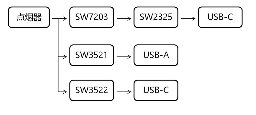 雙獨(dú)立輸出的130W 1A1C雙口車充方案,可以采用SW7203+SW2325/SW2305實(shí)現(xiàn)C口100W輸出,另外一路A口采用SW3522內(nèi)置開關(guān)管的全集成降壓轉(zhuǎn)換器實(shí)現(xiàn)高集成的A口30W輸出。殼實(shí)現(xiàn)雙口真正獨(dú)立快充,而不會(huì)雙口輸出時(shí)降為5V。