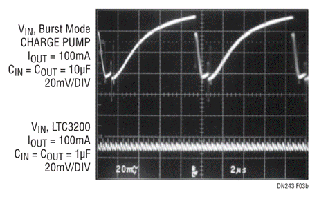 即使采用小型輸出電容器,器件的2MHz振蕩頻率也可允許低輸出紋波,圖2給出了LTC3200-5采用不同值的輸出電容器支持100mA負(fù)載電流時的輸出紋波情況。