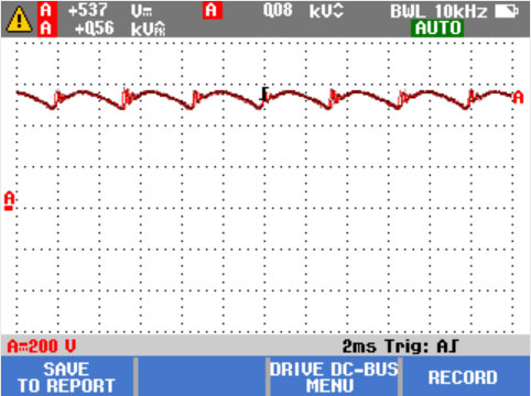 驅(qū)動(dòng)器內(nèi)部的交流-直流轉(zhuǎn)換至關(guān)重要。為獲得最佳驅(qū)動(dòng)器性能,必須要保證電壓正確、充分濾波并保持低紋波水平。高波紋電壓可能說明電容器存在故障或所連接電機(jī)的規(guī)格不正確。Fluke MDA-500 系列 Motor Drive Analyzer 的記錄功能可在承受負(fù)載時(shí)的工作模式下對(duì)直流總線的性能進(jìn)行動(dòng)態(tài)檢查。還可以使用 Fluke ScopeMeter® Test Tool 或高級(jí)萬(wàn)用表進(jìn)行此測(cè)試。