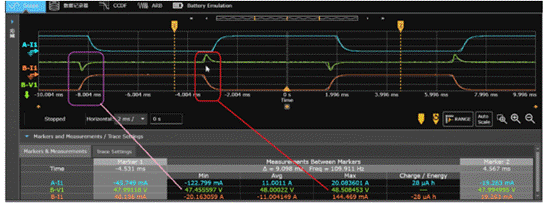 如下圖所示,我們利用APS電源拉載脈沖電流,同時(shí)利用其200KSa/s(18bit)高速采樣能力監(jiān)測(cè)電池的端電壓,可以看到其變化呈現(xiàn)3個(gè)不同階段。