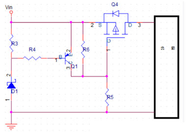 Vin正常輸入電壓時,穩(wěn)壓管沒有反向擊穿,R3,R4電流基本為0。PNP三極管的Vbe=0,即PNP三極管不導通。PMOS管Q4的Vgs由電阻R5,R6分壓決定,PMOS管導通,即電源正常工作。