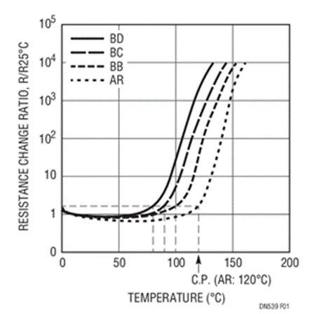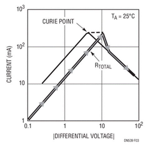 圖3示出了疊加在PTC I-V特征曲線上的RTOTAL線。箭頭線是針對各種不同 VDIFF 之平衡電流的軌跡。當 VDIFF 增加時,平衡電流沿著總電阻曲線增大。當該差分電壓產(chǎn)生了一個超過居里點電流的平衡電流時,PTC 電阻增加,并最終在總的電路電阻中居主導地位。居里點電流在產(chǎn)品手冊中被稱為跳變電流。隨著PTC電阻的不斷增加,平衡電流驟降,并逐漸接近PTC I-V曲線的負斜率。