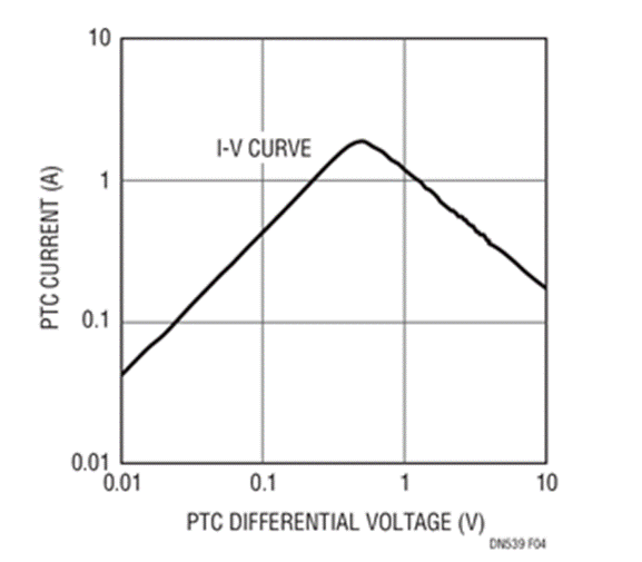 這里的實例采用了一個具有 1.9A 跳變電流和 0.27Ω 冷電阻的 PTC (PTGLASARR27M1B51B0)。圖 4 中示出的PTC I-V曲線是在實驗室得出的。
