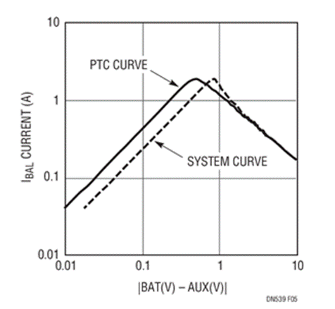 最后,在 AUX 電池和被平衡的電池之間傳輸了足夠的電荷,而且VDIFF開始下降。當VDIFF減小時,則在另一方向遵循 I-V 特征曲線。隨著 VDIFF 的減小,平衡電流遵循RTOTAL I-V曲線而增大,直至其達到居里點電流為止。PTC電阻在該點上保持恒定,而平衡電流的變化則遵循RTOTAL 線。