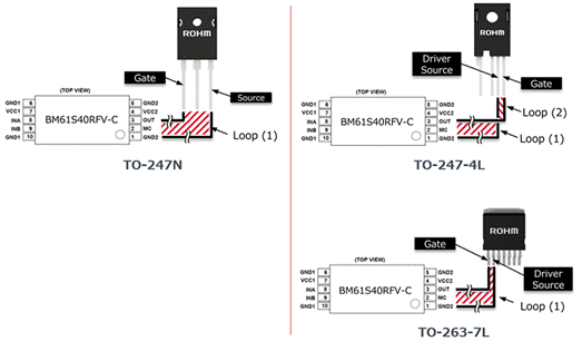 由于具有驅(qū)動器源極引腳的TO-247-4L封裝和不具有驅(qū)動器源極引腳的TO-247N封裝的引腳分配不同,因此在圖案布局時需要注意。