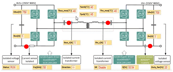 下圖為某雙向DC-DC電源模塊示意圖,圖中紅色圓圈●標(biāo)識(shí)位置均為電流測量傳感器,配合電壓測量傳感器以實(shí)現(xiàn)實(shí)時(shí)功率、效率等參數(shù)的精確測量。