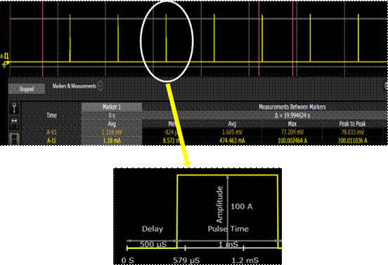 在對分流器測試過程中,為了避免持續(xù)大電流導(dǎo)致被測產(chǎn)品的溫升,APS先進(jìn)電源系統(tǒng)輸出100A,1mS電流脈沖,通過設(shè)置占空比,平均電流僅僅474mA。如下圖: