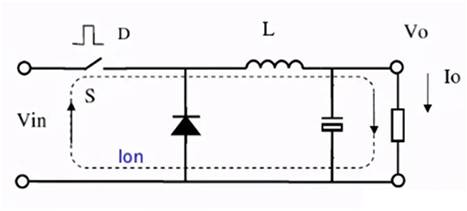 當(dāng)開關(guān)導(dǎo)通時(shí):輸入電壓Vin加到LC濾波器的輸入端,電感上的電流以固定斜率線性上升。如下圖