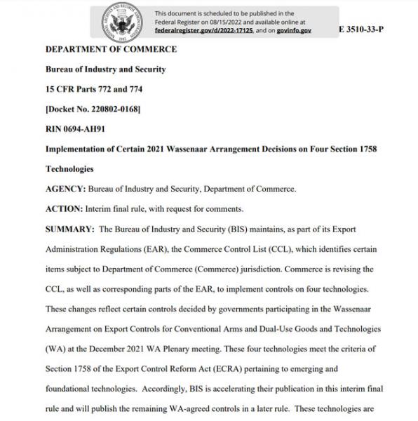 根據(jù)公報(bào), 美國(guó)工業(yè)與安全局決定對(duì)《商務(wù)部管制清單》(CCL)和《出口管理?xiàng)l例》(EAR)同步實(shí)施修訂,對(duì)四項(xiàng)技術(shù)實(shí)施管制。