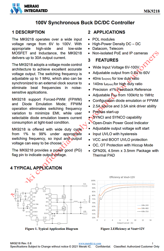 MK9218可用于負載點模塊,高功率密度直流電壓轉(zhuǎn)換,數(shù)據(jù)和電信應(yīng)用,非隔離PoE和網(wǎng)絡(luò)攝像頭等高壓降壓應(yīng)用。得益于高壓輸入,非常適合應(yīng)用在USB PD3.1充電器以及相關(guān)的降壓應(yīng)用場合,提供高輸入耐壓,高效率的電壓轉(zhuǎn)換。 |