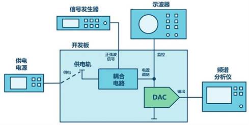 耦合電路的輸出通過一個示波器監(jiān)控,以監(jiān)控實際電源調(diào)制。最終得到的DAC輸出,由頻譜分析儀檢測得出。