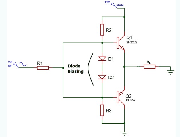 可以看出,AB類放大器挽放電路實(shí)際上上A類和B類放大器的組合。通過添加二極管,即使在基極端沒有信號(hào)的情況下,晶體管也被偏置在輕微的導(dǎo)通狀態(tài),從而消除了交叉失真問題。