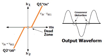 現(xiàn)在為什么當(dāng)V IN達(dá)到零時(shí)會(huì)發(fā)生交叉失真?可以看看下面顯示的推挽放大器電路的粗略特性圖和輸出波形。
