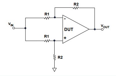有不同的方法來測量共模抑制比。在下圖中,小編將運算放大器配置為差分放大器的四個精密電阻。一個信號應(yīng)用于兩個輸入,測量輸出的變化,一個具有無限CMRR的放大器也沒有輸出變化。