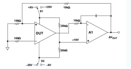 與上述電路相比,以下電路更為復(fù)雜,無需使用精密電阻即可測量CMRR。通過切換電源電壓來改變共模抑制比。實際上,該電路可以很容易地實現(xiàn),并且通過使用相同的電路,可以應(yīng)用不同的電源電壓來測量電源抑制比。