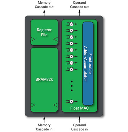 在Speedster7t上搭載的機(jī)器學(xué)習(xí)處理器(MLP)是一種優(yōu)化的矩陣/向量乘法模塊,能夠在單個(gè)時(shí)鐘周期內(nèi)進(jìn)行32次乘法和1次累加,是計(jì)算引擎架構(gòu)的基礎(chǔ)。AC7t1500器件中的Block RAM(BRAM)與2560個(gè)MLP實(shí)例都處于同一位置,這意味著更低的延遲和更高的吞吐量。