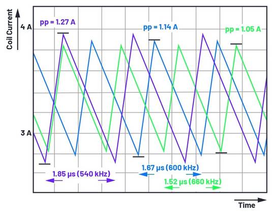 圖 2. 受開關頻率變化影響的峰到峰線圈電流紋波