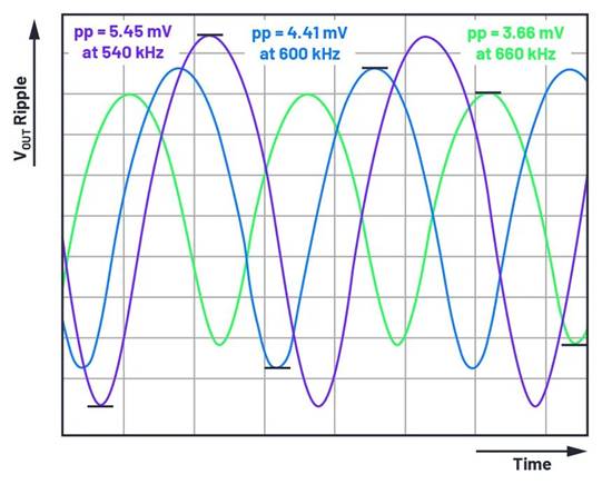 圖 3. 在開關模式穩(wěn)壓器 IC 中,開關頻率變化導致的輸出電壓紋波變化