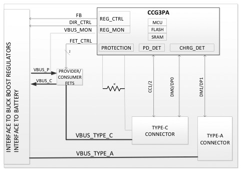 如今,可以使用專為滿足移動(dòng)電源和電源適配器應(yīng)用要求而設(shè)計(jì)的 Type-C 控制器。例如,賽普拉斯半導(dǎo)體的 EZ-PD CCG3PA 控制器支持具有可編程電源 (PPS) 模式的 USB PD 3.0 規(guī)范。該控制器還支持傳統(tǒng)的 BC1.2 和各種專有充電方法,如高通快速充電(QC)、三星自適應(yīng)快速充電 (AFC) 和 Apple 充電。