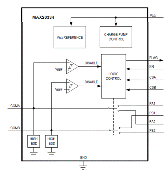 所有引腳均采用了ESD保護(hù)結(jié)構(gòu),以防止在處理和組裝過程中遭受高達(dá)±2kV(人體模型)的靜電放電。COMA和COMB(圖2和圖3)進(jìn)一步受到高達(dá)±15kV(人體模型)、±15kV(IEC 61000-4-2中描述的氣隙放電方法)和±8kV(IEC61000-4-2中描述的接觸放電方法)的ESD保護(hù),且不會造成損壞。ESD結(jié)構(gòu)在正常運(yùn)行和設(shè)備斷電時(shí)均可承受高ESD。在ESD事件之后,IC繼續(xù)工作,而不會發(fā)生閂鎖。該IC受到-30V至+45V(IEC61000-4-5)的浪涌保護(hù)和高達(dá)+20.5V的過壓保護(hù)。圖4將這種高度集成的擴(kuò)展保護(hù)解決方案的PCB布局與提供純正電涌保護(hù)及較低OV和ESD保護(hù)的典型競爭產(chǎn)品進(jìn)行了比較。后者需要額外的電路來滿足ESD/浪涌/OV規(guī)范要求,增加了BOM成本, 并且PCB占用空間擴(kuò)增了5倍。