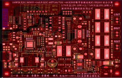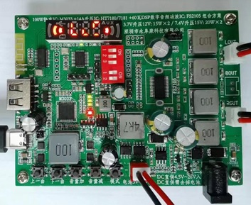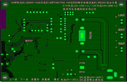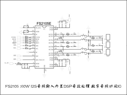 (三)音頻放大部分采用FS2105,15V供電輸出2*20W/4歐(THD+1%);FS2105E是一款集成傅里葉FS Techno音效算法的雙通道中功率音頻放大芯片,最高支持2x30W立體聲BTL或60W單聲道PBTL輸出。相比較傳統(tǒng)模擬輸入的音頻功放,在底噪、信噪比等方面優(yōu)勢(shì)明顯;內(nèi)置15段EQ調(diào)節(jié)及三段DRC,簡(jiǎn)潔的調(diào)音軟件界面工程師容易上手,實(shí)現(xiàn)完美的音質(zhì)輸出。