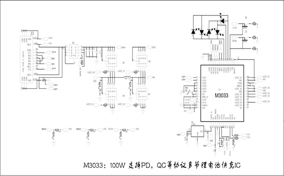 (一)整體方案設(shè)計(jì)電源采用兩節(jié)鋰電串聯(lián)供電,充電芯片采用M3033;M3033是一款內(nèi)置PD2.0/QC2.0等快充協(xié)議的多節(jié)100W升降壓鋰電充電管理芯片,工作電壓范圍 4.5-25V、可支持2-7串鋰電快速充電。現(xiàn)在隨著音箱功率越做越大,為保證續(xù)航時(shí)間而加大電池容量,戶(hù)外藍(lán)牙音箱很多采用兩串多并,傳統(tǒng)的充電管理芯片充電過(guò)程過(guò)于漫長(zhǎng),M3033能實(shí)現(xiàn)大容量鋰電池組快速充電。直接使用Type-C充電,無(wú)需專(zhuān)用適配器、避免資源浪費(fèi)。