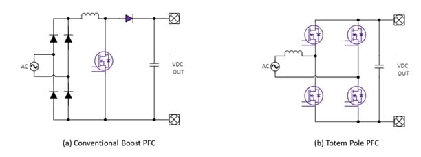 圖2:從升壓拓?fù)?a)更改為圖騰柱PFC (b)可提高效率并允許雙向操作。