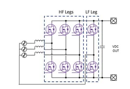 在許多歐洲家庭中,三相電源很容易獲得,但典型的美國家庭、亞洲和南美家庭只有標(biāo)準(zhǔn)的單相240 V。在這種情況下,設(shè)計需要大功率的22 kW OBC,它可以同時兼容單相和三相以減少OBC的數(shù)量。第四條橋臂被添加到傳統(tǒng)的三相PFC中,這樣設(shè)計人員就可以對單相輸入使用交錯技術(shù)。圖7顯示了一個交錯式圖騰柱PFC,它具有三個高頻橋臂和第四個低頻橋臂,每個PFC的高頻橋臂通過32 mΩ 1200 V SiC MOSFET提供6.6 kW的功率。低頻橋臂可以使用兩個Si IGBT來降低成本。當(dāng)三相可用時,該電路可以自動重新配置為三相工作,使第四條橋臂懸空不用。
