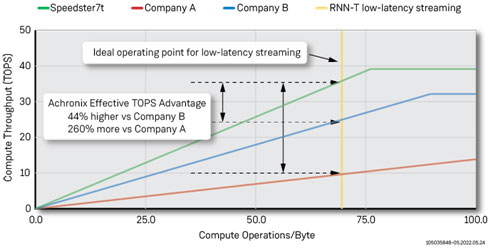 將所有這些功能放在一個(gè)roofline圖中,就可以清楚地說明Achronix Speedster7t器件在低延遲ASR應(yīng)用中相對于其他競爭性FPGA解決方案的優(yōu)勢。該roofline圖使用了由每個(gè)制造商公布的經(jīng)過驗(yàn)證的TOPS數(shù)據(jù),展示了這些器件在實(shí)際應(yīng)用中可以達(dá)到的效果。