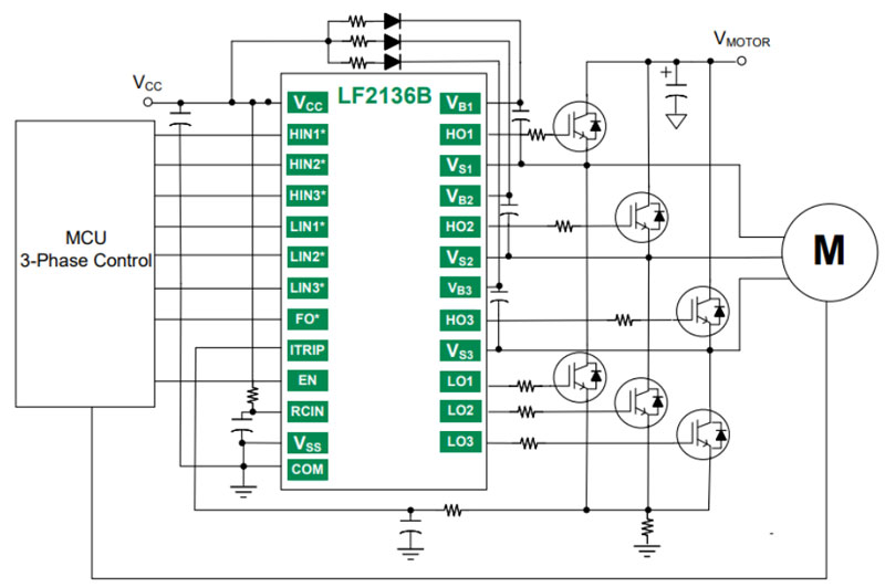 LF2136BTR是Littelfuse柵極驅(qū)動器系列中的一款,除了LF2136BTR這種三相柵極驅(qū)動器IC,還包括高壓高速柵極驅(qū)動器,均具有高壓屬性,以及優(yōu)質(zhì)的驅(qū)動特性、兼容特性和保護特性,并且都能夠在-40°C至+125°C的寬溫度范圍內(nèi)工作,可用于打造半橋柵極驅(qū)動器、三相半橋柵極驅(qū)動器和高側(cè)/低側(cè)柵極驅(qū)動器。其中,半橋柵極驅(qū)動器和高側(cè)/低側(cè)柵極驅(qū)動器可經(jīng)過進一步設(shè)計用于DC-DC轉(zhuǎn)換器、交流-直流逆變器電機控制、電機驅(qū)動器、D類功率放大器等應(yīng)用;三相半橋柵極驅(qū)動器則可以用于三相電機變頻器驅(qū)動器、白色家電-空調(diào)、洗衣機、冰箱、工業(yè)電機逆變器-電動工具、機器人,以及通用三相變頻器等。