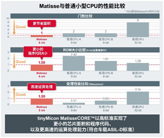 tinyMicon MatisseCORE™(Matisse: Micro arithmetic unit for tiny size sequencer)是ROHM自主開發(fā)的8位微處理器(CPU),該產(chǎn)品旨在隨著物聯(lián)網(wǎng)技術(shù)的發(fā)展來提高模擬IC的智能化程度。憑借針對嵌入式應(yīng)用而優(yōu)化的指令集和最新的編譯器技術(shù),以高標(biāo)準(zhǔn)實現(xiàn)了更小的芯片面積和程序代碼、以及更高速的運(yùn)算處理能力。此外,該產(chǎn)品還符合汽車功能安全標(biāo)準(zhǔn)“ISO 26262”、ASIL-D等的要求,適用于對可靠性要求高的應(yīng)用。另外,利用內(nèi)置的自有“實時調(diào)試功能”,在調(diào)試時的處理可以完全不影響應(yīng)用程序的運(yùn)行,因此能在應(yīng)用產(chǎn)品工作的同時進(jìn)行調(diào)試。